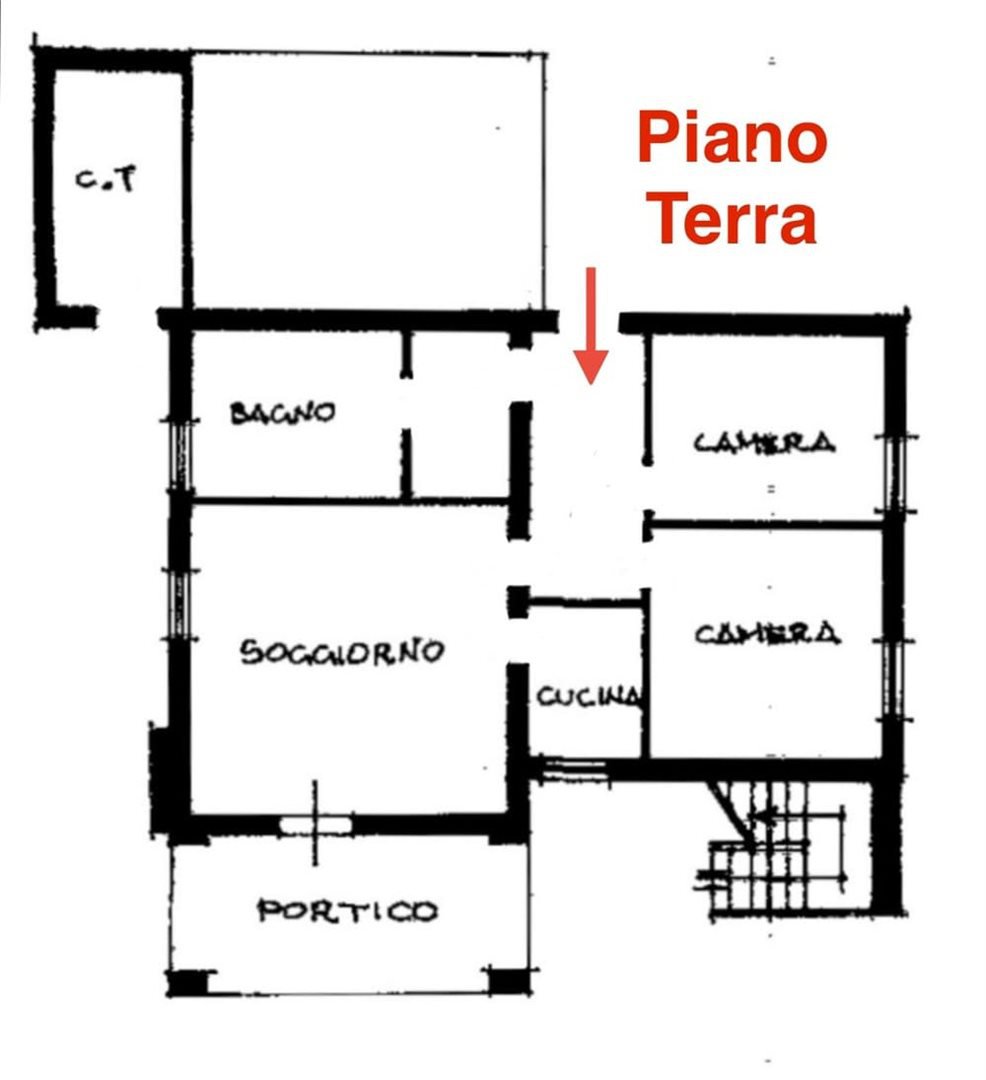 Piano Terra: appartamento indipendente di 92 mq con ingresso, sala con portico, cucinotto, due camere, bagno e centrale termica